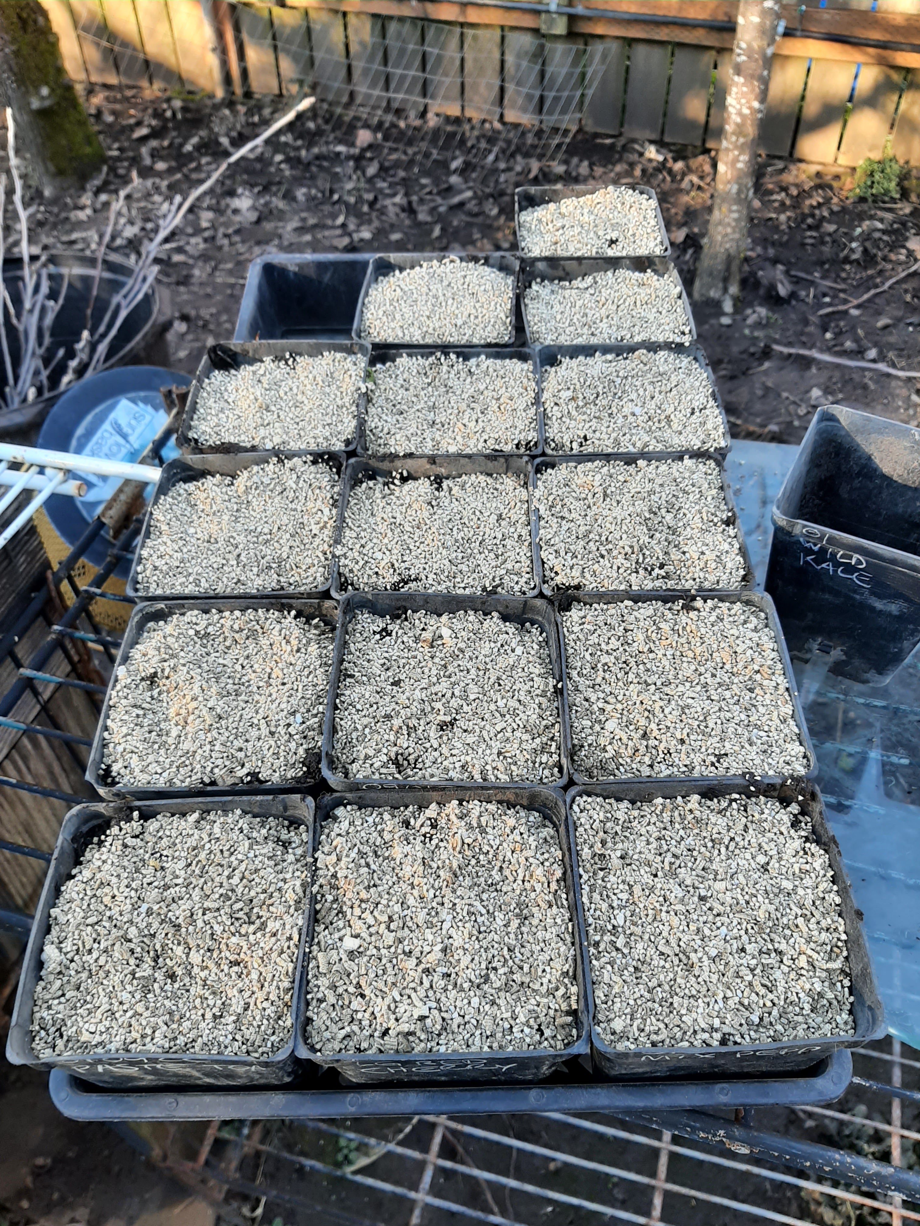 After this, I set about planting some seeds in 4" pots in the greenhouse. To start, I got out the pots and selected some seeds from the list to which I refer often, from the Down to Earth garden center. Using a white grease pencil, I labeled the pots with today's date and what will be planted there.